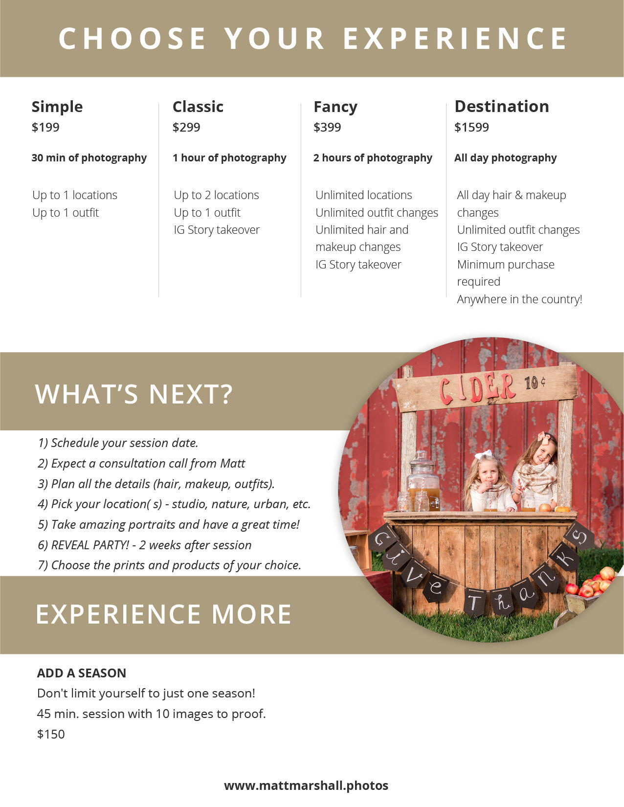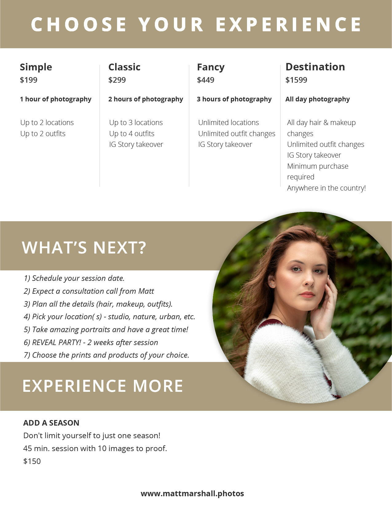This is a time for you to indulge in the beauty of your youth, so we’ve completely torn apart our original pricing structure and now allow you to customize your pricing! You get to choose from four different types of experiences when you book your senior or family portraits with Matt Photos.After your senior or family experience, we’ll schedule your Reveal Party where you can pick your fine art prints, books, and canvases! This is a time that can never be replaced, contact Matt Photos today to preserve who you are today as you take on life’s great journey.